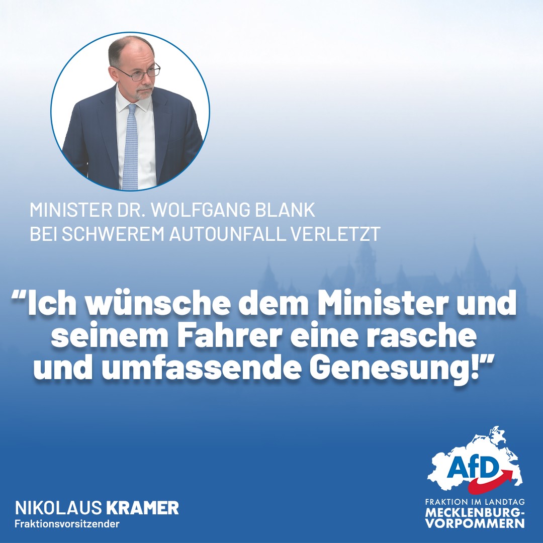 Mecklenburg-Vorpommerns Minister für Wirtschaft, Infrastruktur, Tourismus und Verkehr wurde heute früh bei einem schweren Autounfall verletzt. Die Nachricht hat mich bestürzt. Ich wünsche dem Minister