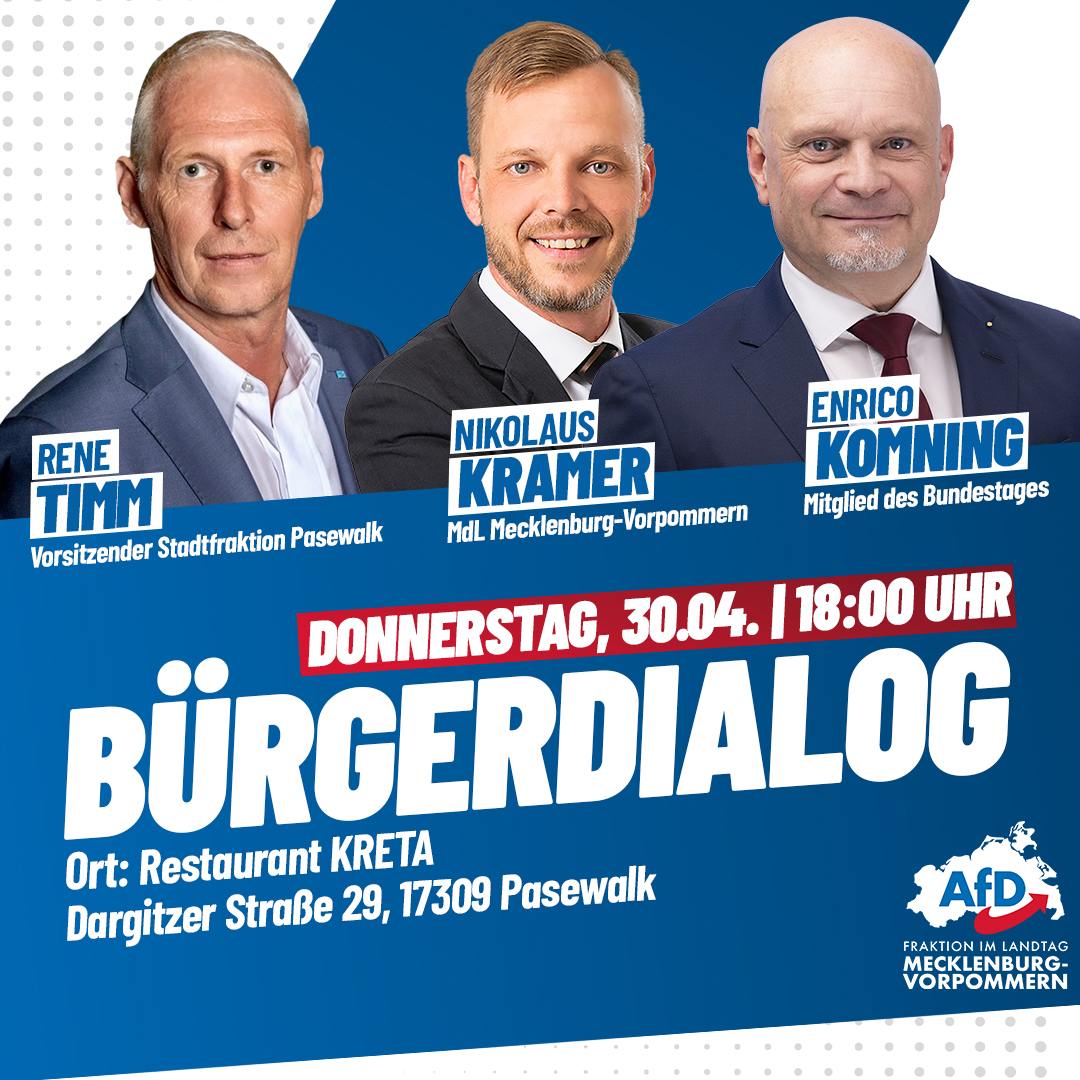 Am 30.04.2026 begrüßen wir euch zu Bürgerdialog unserer Landtagsfraktion im Restaurant Kreta in Pasewalk. Mit dabei sind außerdem noch Enrico Komning, Mitglied des Bundestages, und