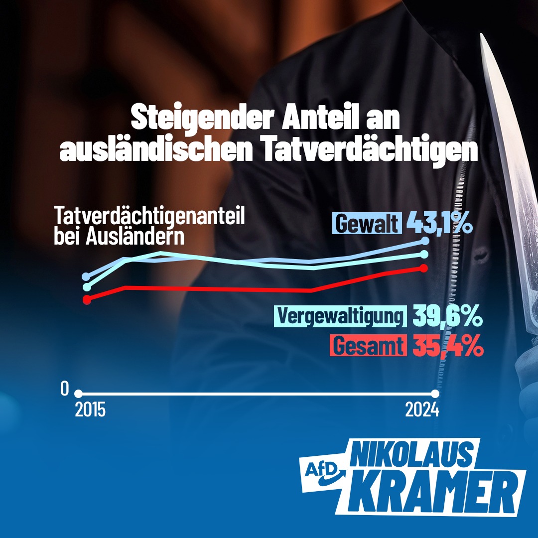 Wer diese Entwicklung weiter verharmlost, verweigert sich der Realität. Der Anteil ausländischer Tatverdächtiger liegt bei Gewaltdelikten bereits bei 43,1% und bei Vergewaltigung sowie schwerem sexuellem